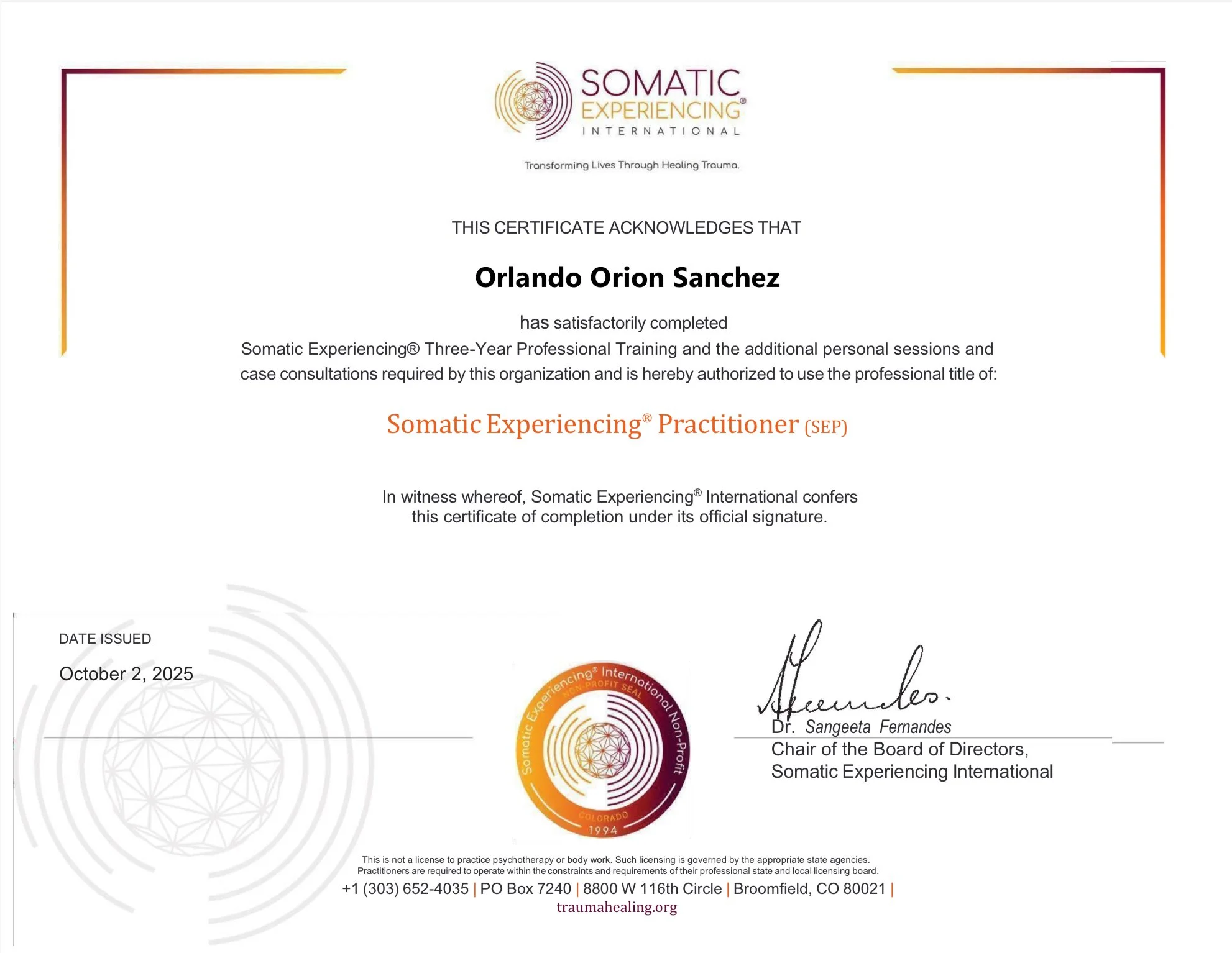 I’m Orlando Orion Sanchez, a Somatic Experiencing® practitioner, narrative embodiment coach, and Roxiva Light Therapy facilitator devoted to helping people feel more grounded, peaceful, and connected to themselves. My work bridges body, mind, and spirit — blending somatic awareness, narrative exploration, and intuitive energy work to support deep integration and healing.